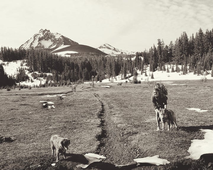 DAY 1 / 6 MILES: The antsiness has been lingering in my body and mind all day. Eagerness paired with impatience to get out of Sisters, Oregon and get up into the mountains to start this trip. Nothing against Sisters, that’s for sure, because it has actually been one of my favorite places of this whole roadtrip so far with its small walkable downtown, 7 day a week farmers market, and little creek running through the campground where we would take the dogs to cool off. It’s been 100+ degrees most days this week and it’s been hard to sleep, so the mountains are a hopeful reprieve from the heat and also that lack of sleep. That plus I’ve just been so anxious to sleep in a tent again. It has been a while since we’ve left the comforts and convenience of the truck camper and gone overnight into wilderness. Gone gone gone. The truck camper is luxurious and has all of the things but maybe that’s the reason.. it has all of the things. And sometimes all of the things feels like too much and I crave the simplicity of a backpack and my own two feet moving against the gritty earth beneath me.