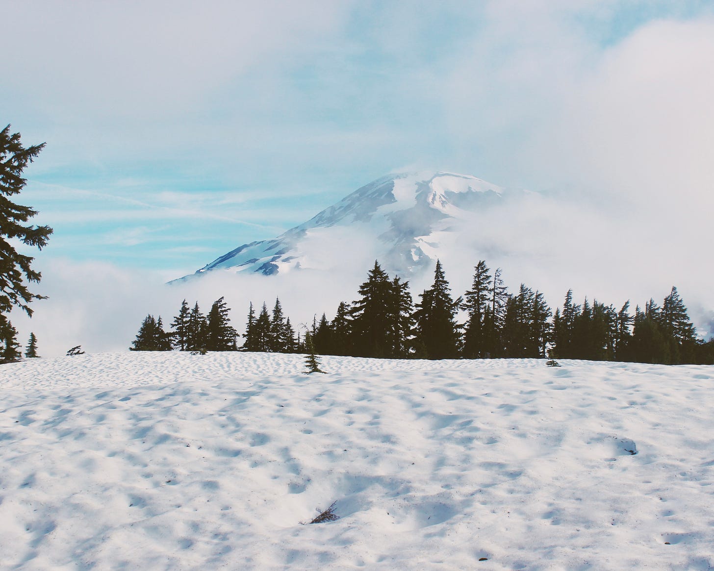 I wake up ready to do some mile-crushing and see some beautiful landscapes. I partially know where we will be walking for most of this day because I have already hiked these miles in the opposite direction, north bound, in 2022 on the Pacific Crest Trail. I know we’re going to hit the Obsidian Trail and some gorgeous wildflower meadows, and I tell this to Sam. Almost immediately after we join up with the PCT and begin hiking south we are confronted by a giant obstacle— a massive snow wall about our height and a half that rises straight up from the dirt footpath we had previously been walking on. From here on out, snow covers mostly every inch of the trail and instead of smooth sailing alongside wildflower meadows, we are walking on a blanketed winter wonderland.